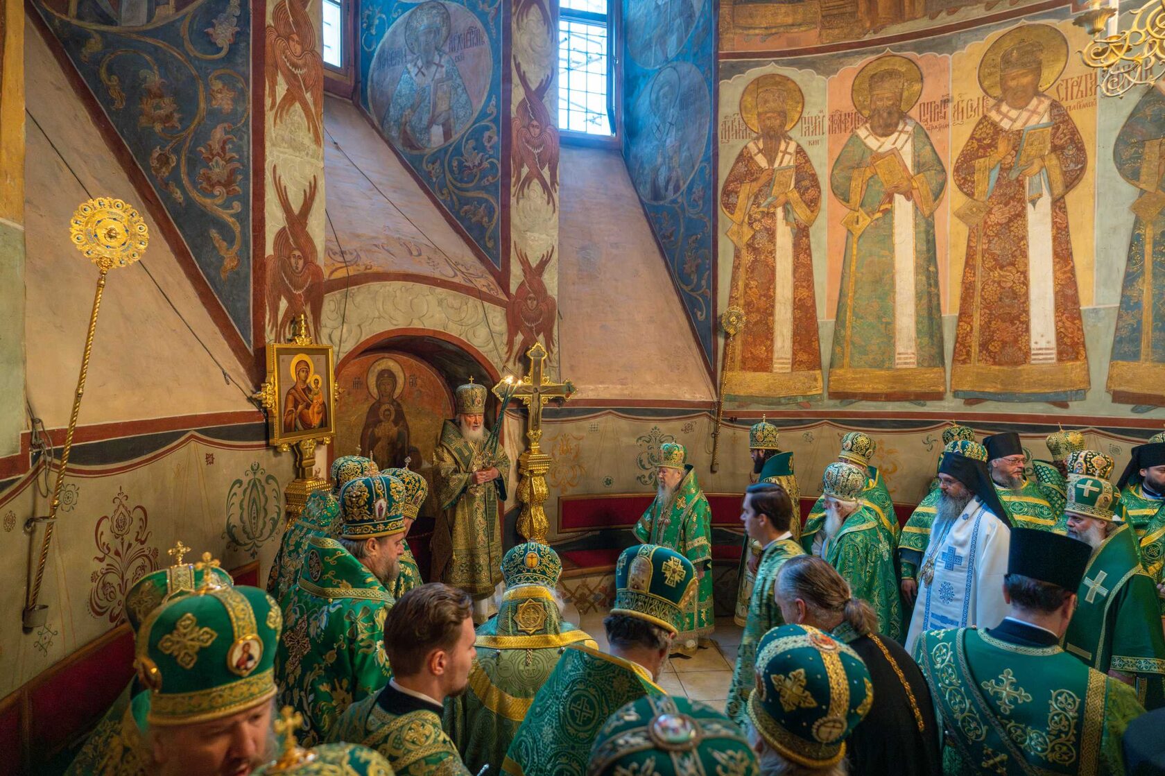 По климатическим условиям мы не смогли сегодня совершить молебен на площади, а совершаем его здесь. Но как Господь присутствует везде, так и молитва может возноситься к Нему везде, во всякое время и во всяком месте, тем более в таком великолепном храме, как главный храм главной обители нашей Церкви — сей Успенский собор.